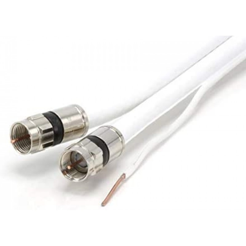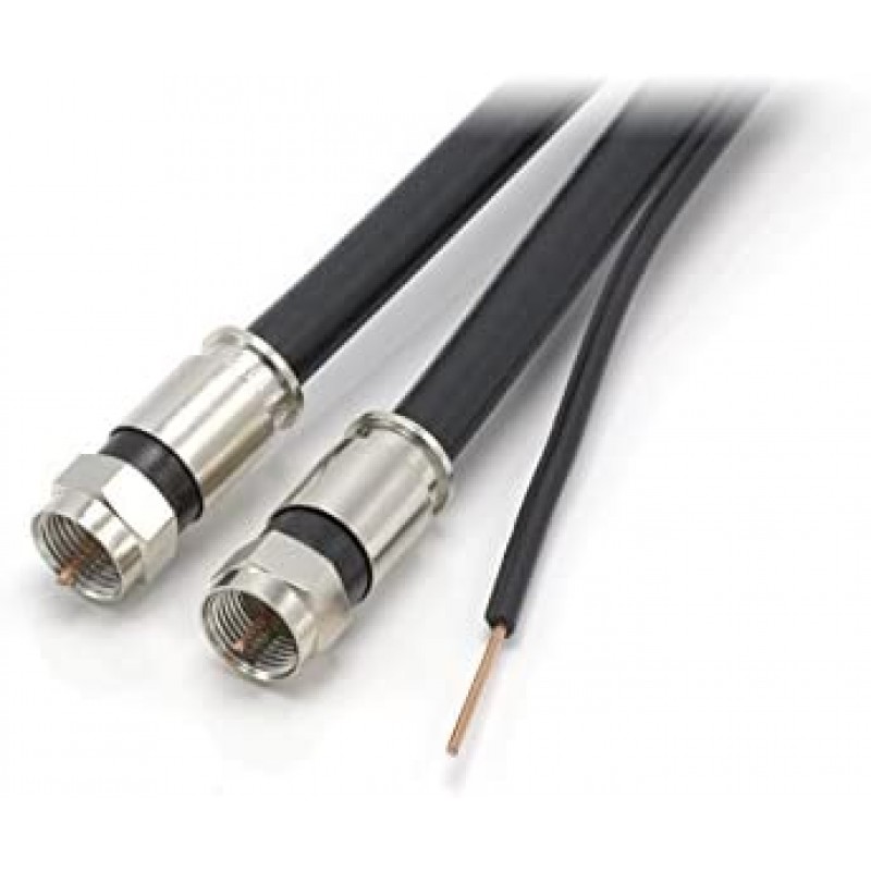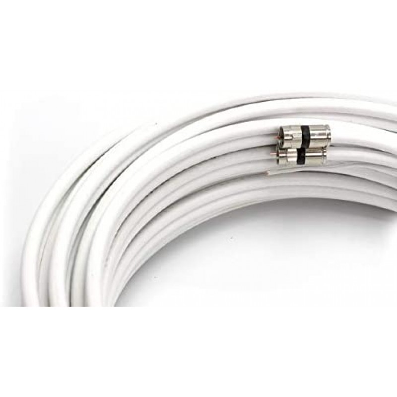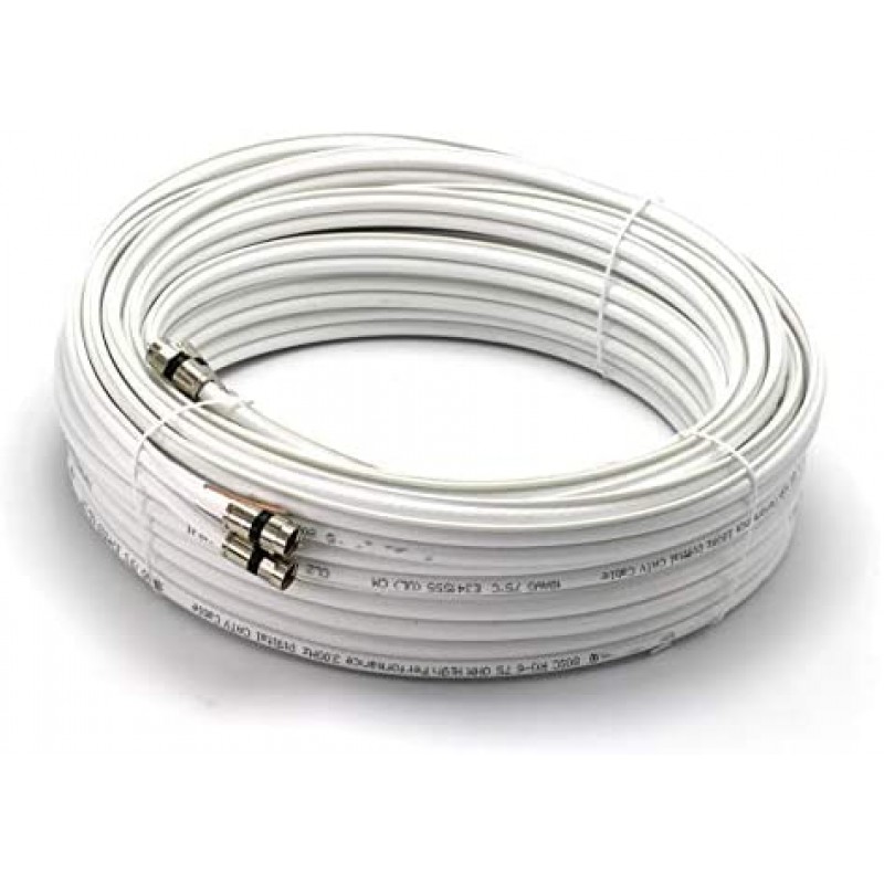 This cable is available in Black and White, and comes in lengths from 1 foot to 200 feet (including our most popular lengths of 50 feet, 75 feet, 100 feet, 150 feet, and 200 feet). The center conductor is made of high grade copper coated steel that has been swept to 4.0GHz, making this a great application for Satellite, Cable, Wireless (including cell services), and Communication uses. With very low signal attenuation (2.75dB at 750MHz for our 50' cable) it can be used on long runs without the loss of signal or picture. We use high grade 360 degree compression connectors to ensure that this cable remains water and weather proof, without the loss of any signal. This ensures that the ends can withstand pulling, weather, extreme hot and cold (rated up to 167 degrees F). The coaxial shielding is 60% aluminum magnesium alloy braid and 100% solid aluminum foil (including an 18% overlap) to ensure that there is no interference from neighboring or rouge signals. The outer jacket is a flexible UV resistant PVC and has been tested to be used in many extreme conditions for use both inside and outside. The dielectric center is made from gas injected foam PE and has an almost perfect consistency of 75 Ohms +/-3 throughout the entire length of the coax cable. The outside diameter of the cable is 0.27 inches, about 6.85 mm, with the connectors being slightly larger at .4375 (7/16) of an inch (11.11 mm).