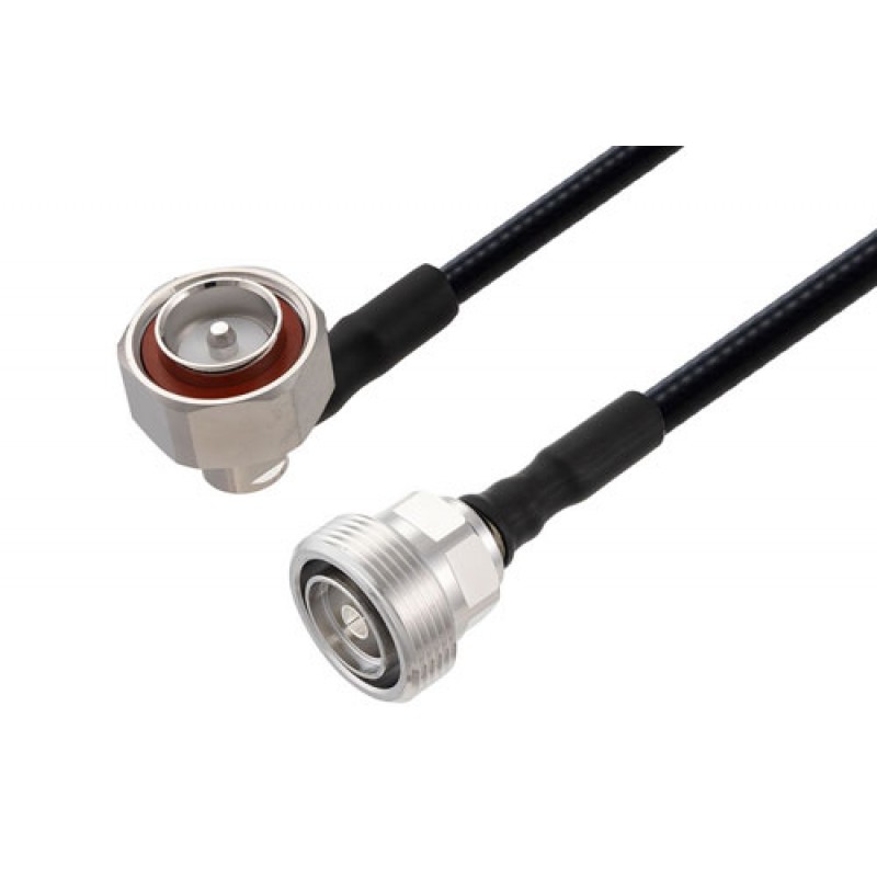 Ebeestock RF coax low PIM cable assembly is built with right angle 7/16 DIN cable connection on one end and 7/16 DIN cable connection on the other. Our low PIM right angle 7/16 DIN to 7/16 DIN cable assemblies have a male gender on end 1 and female on end 2. This 7/16 DIN to 7/16 DIN cable is a male to female coax assembly, ET16940, can also be known as a low PIM right angle 7/16 DIN plug to 7/16 DIN jack cable assembly and will be shipped same-day as it is purchased.