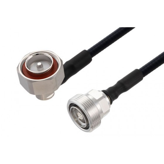 Ebeestock RF coax low PIM cable assembly is built with right angle 7/16 DIN cable connection on one end and 7/16 DIN cable connection on the other. Our low PIM right angle 7/16 DIN to 7/16 DIN cable assemblies have a male gender on end 1 and female on end 2. This 7/16 DIN to 7/16 DIN cable is a male to female coax assembly, ET17039, can also be known as a low PIM right angle 7/16 DIN plug to 7/16 DIN jack cable assembly and will be shipped same-day as it is purchased.