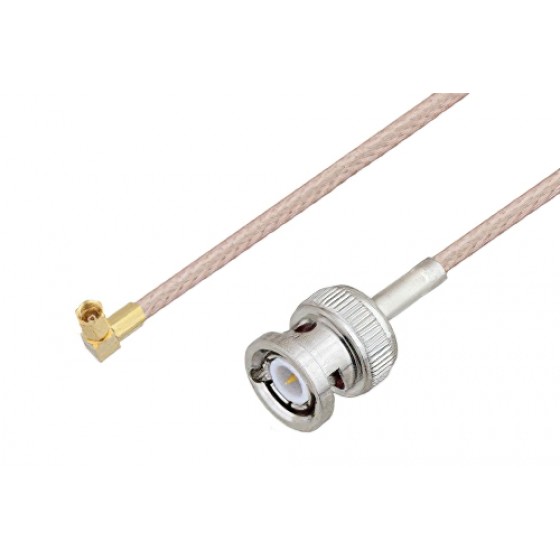 Ebeestock RF coax cable assembly is built with BNC cable connection on one end and right angle SSMC cable connection on the other. Our BNC to right angle SSMC cable assemblies have a male gender on end 1 and plug on end 2. This BNC to SSMC cable is a male to plug coax assembly, ET20002, can also be known as a BNC plug to right angle SSMC male cable assembly and will be shipped same-day as it is purchased.