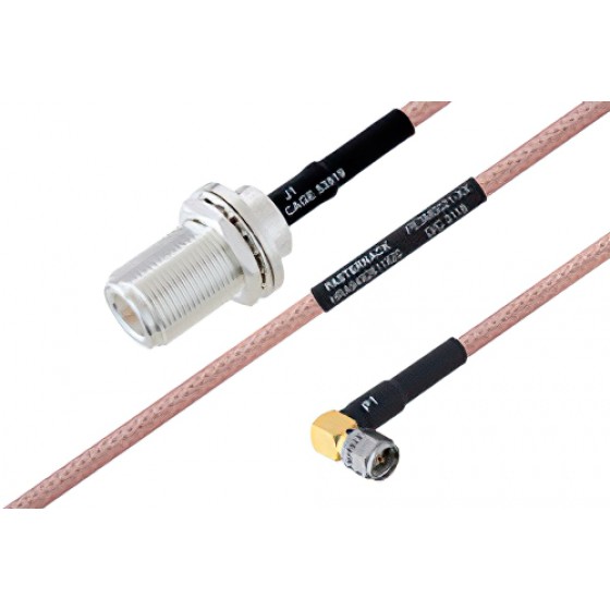 MIL-DTL-17 N Female Bulkhead to SMA Male Right Angle Cable 12 Inch Length Using M17/60-ET-RG142 Coax