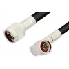Ebeestock RF coax cable assembly is built with N type cable connection on one end and right angle N type cable connection on the other. Our type N to right angle type N cable assemblies have a male gender on end 1 and male on end 2. This N type to type N cable is a male to male coax assembly, ET27924, can also be known as a type N plug to right angle type N plug cable assembly and will be shipped same-day as it is purchased.