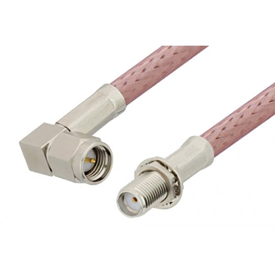 Radio frequency assembly SMA male right angle to SMA female bulkhead cable 6 inch length using ET-RG142 coax, RoHS from Ebeestock is part of the largest selections of same-day ship coaxial cables for RF, microwave and millimeter wave interconnect solutions. Ebeestock coaxial cable assembly products are used in applications requiring high quality such as laboratory RF test and measurement, rugged and designed for defense / military, telecom antenna tower component jumper connection, production environments, general use, etc. SMA male right angle to SMA female bulkhead cable 6 inch length using ET-RG142 coax, RoHS, like our other Ebeestock coaxial cable assemblies, will ship the same day and any custom SMA to SMA cable assembly orders will ship same day as well.