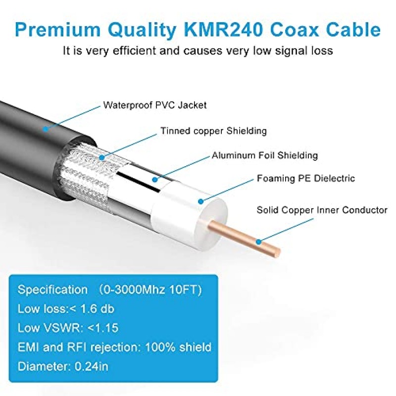 - Ultra Low - loss n male to sma male Coax Cable - It is ideal with an 50-Ohm impedance and work for any 50 Ohm RF system. The signal loss of this n-sma 50 Ohm cable is less than 1.79db on 1800MHz. Swr is less than 1.15. It could support better signal transfer with minimum signal loss over large distances and higher frequency use. This KMR240 cable is LMR240 equivalent (if you’re familiar with those).