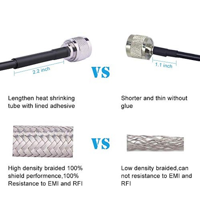- Prevent Pulling Out Connector - The connection of N male to SMA male cable is length up to 2.2" heat shrinking tube built with an inner adhesive. Compared with other shorter without glue cable, this would provide a heavy duty and professionally connection between cable and adapters. Our 50 ohm jumper cable is made solidly for prevent falling apart. It is support to screw easily and snugly.