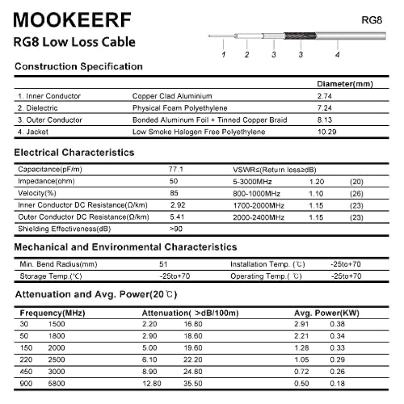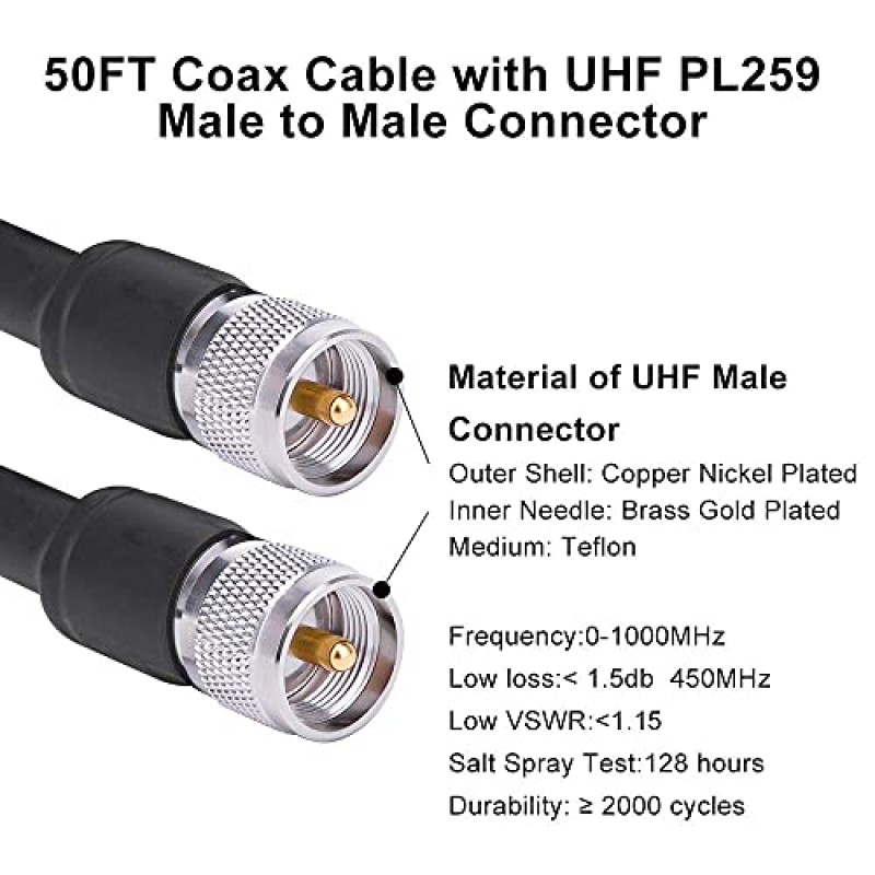 - ⭐LOW LOSS : The loss of 50ft RG8 pl259 coaxial cable at 450MHZ signal frequency is less than 1.5dB and the SWR ≤ 1.25. It is a low loss uhf coax cable with PL259 plugs on the both ends. There is no need to worry about signal loss for long-distance high-frequency use.