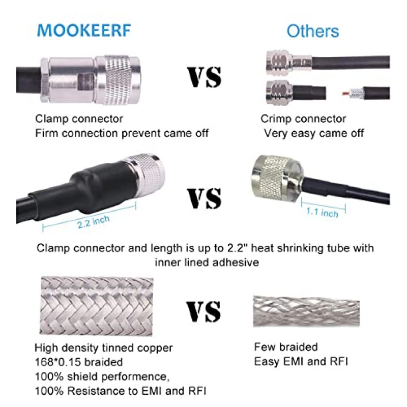 - ⭐Prevent Fall Apart or Break : Connection between UHF male connector and RG8 coaxial cable end is equipped with a 2.2" heat shrink tube with lined adhesive which is longer than other cable 's 1.1” heat shrink tube . And the connector is use clamp design but not crimp. It is very heavy duty and connectors are well integrated into cable. They are preventing breaking easily when using.