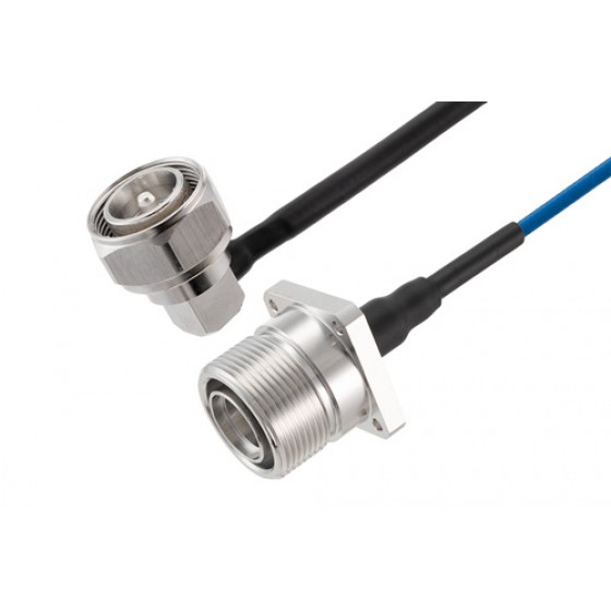 Low PIM 7/16 DIN right angle plug to 7/16 DIN jack 4 hole flange cable assembly is just one of more than 45,000 in-stock RF products available. Ebeestock is where to buy a high quality 7/16 DIN to 7/16 DIN cable assembly for quick shipment worldwide. Variations of 7/16 DIN cable assemblies can also be built and will ship same-day as well, search this website or contact us for assistance. High quality custom RF cable assembly products for microwave and millimeter wave radio transmitter receiver, antenna jumper, component inter-connection and more for RF test & measurement labs, rugged and MIL-STD designed military / defense, aerospace, telecom, phase stable, phase and delay matching, outdoor and harsh environment and other radio frequency applications can be manufactured. For all these reasons and more, Ebeestock is one of the best websites where to find and buy quality RF cable assemblies like this 7/16 DIN male right angle to 7/16 DIN female 4 hole flange low PIM cable 12 inch length using ET38400 coax Times Microwave components.