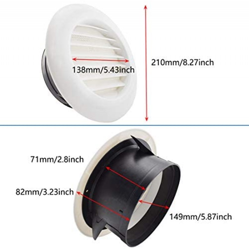 • Air vent bottom diameter: 144mm / 5.68 inch, panel diameter: 210 mm / 8.27 inch, total high: 80 mm / 3.15 inch, mounting high: 74mm / 2.91 inch, available for wall mounted or ceiling mounted, and compatible with 6 inch inline fan system.
