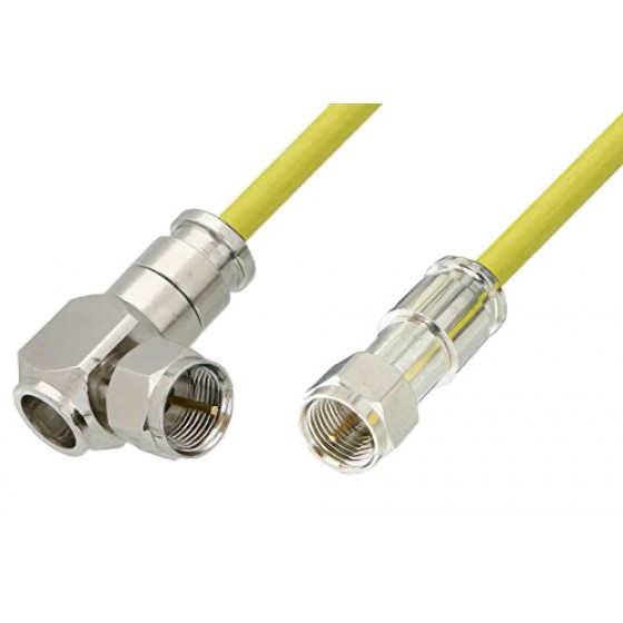 Type F plug to F type right angle plug cable assembly is just one of more than 45,000 in-stock RF products available. Ebeestock is where to buy a high quality type F to type F cable assembly for quick shipment worldwide. Variations of F type cable assemblies can also be built and will ship same-day as well, search this website or contact us for assistance. High quality custom RF cable assembly products for microwave and millimeter wave radio transmitter receiver, antenna jumper, component inter-connection and more for RF test & measurement labs, rugged and MIL-STD designed military / defense, aerospace, telecom, phase stable, phase and delay matching, outdoor and harsh environment and other radio frequency applications can be manufactured. For all these reasons and more, Ebeestock is one of the best websites where to find and buy quality RF cable assemblies like this 75 Ohm F male to 75 Ohm F male right angle cable 12 inch length using 75 Ohm ET38344 yellow coax.