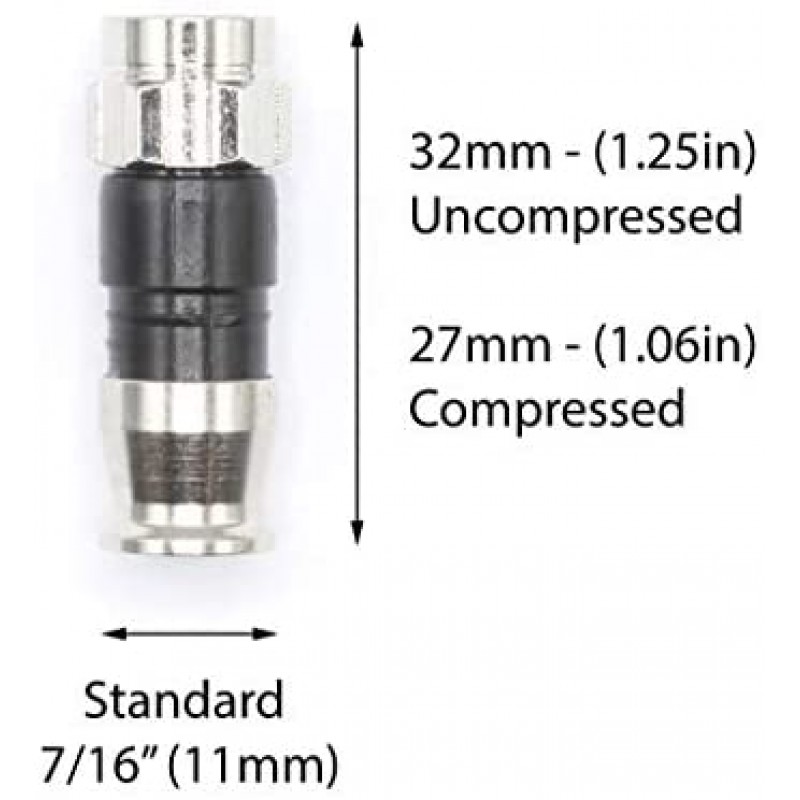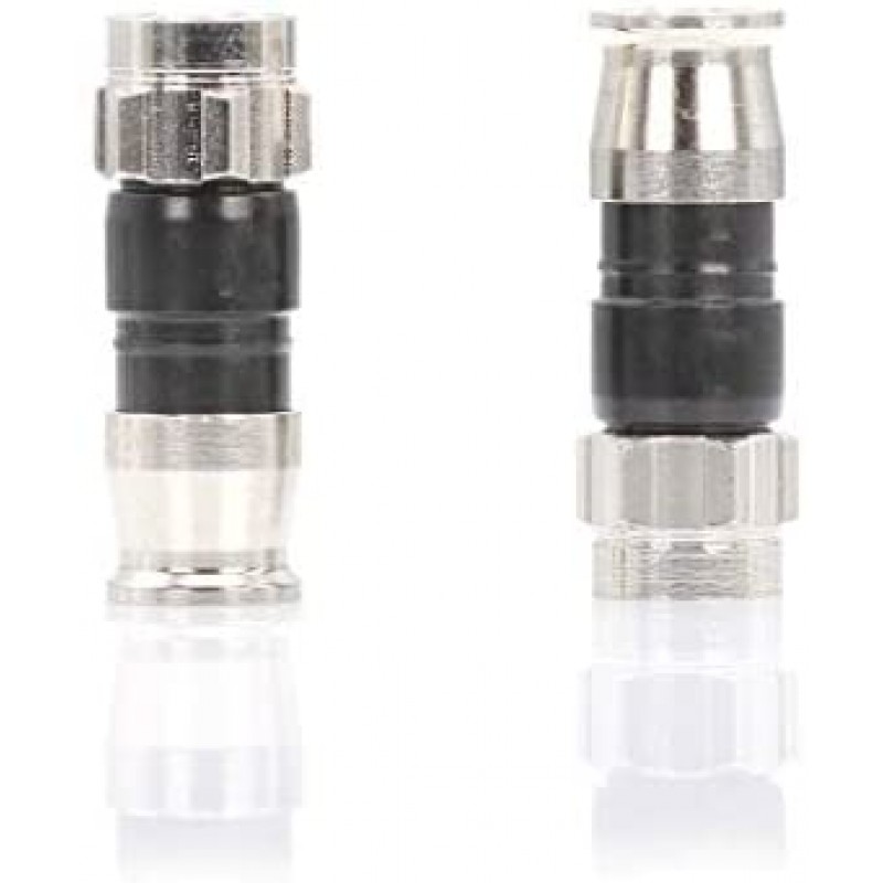 Ebeestock, A Family Company located in the USA, is proud to offer these high quality and durable coaxial compression connectors, also known as coax fittings. Compression F81 Connectors, using the F-Pin connection (standard on US Cable systems). Compression Connectors are superior to Crimp and Twist, as they create a waterproof seal at the rear of the connector (the jacket side), and allow a uniform 360 degree connection that keeps the connector on, and the signal tight. Rated from 2MHz 3GHz, this ensures that the coupler will handle all of the signals for DIRECTV, Satellite Dish, other Satellite, CATV (including Comcast, Charter, Cox, and more), as well as Antennas, VCRs, Cable Internet Modems, and other digital and analog systems. These will pass signal for 75Ohm coax wires. The connector works with most RG59 Coax, including Dual Shield, Tri Shield, and Quad Shield. Exceptional return loss and insertion loss specifications. Shielding effectiveness is greater than -90dB. Tests Passed: SCTE-103-2004 (DC Contact Resistance); ANSI/SCTE 60-2004 (Moisture Migration Test); ASTM-B117-03 (Salt Spray Test); ANSI/SCTE-99-2004 (Axial Pull Test); SCTE-98-2004 (Tightening Torque); SCTE-73-2002 (Coaxial Insertion Force); SCTE-48-3-2004 (Shielding Effectiveness); ANSI/SCTE-04-1997 (F Connector Return Loss); SBCA Standards of Physical Dimension Tolerance; and GR-1503-Core, Issue 1, March 1995 (UV Degradation). Connector works with all 21mm "closed" gap tool. We back our product 100%, with easy returns, as well as free technical and customer support.
