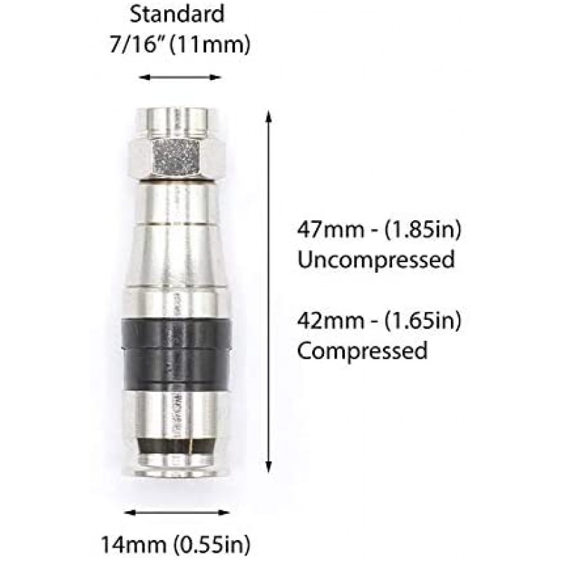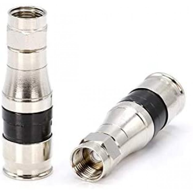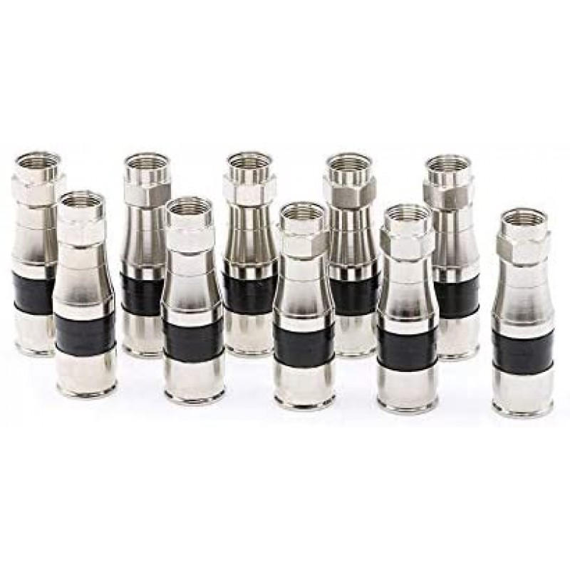 Ebeestock, A Family Company located in the USA, is proud to offer these high quality and durable coaxial compression connectors, also known as coax fittings. Compression F81 Connectors, using the F-Pin connection (standard on US Cable systems). Compression Connectors are superior to Crimp and Twist, as they create a waterproof seal at the rear of the connector (the jacket side), and allow a uniform 360 degree connection that keeps the connector on, and the signal tight. Rated from 2MHz 3GHz, this ensures that the coupler will handle all of the signals for DIRECTV, Satellite Dish, other Satellite, CATV (including Comcast, Charter, Cox, and more), as well as Antennas, VCRs, Cable Internet Modems, and other digital and analog systems. These will pass signal for 75Ohm coax wires. The connector works with most RG11 Coax, including Dual Shield, Tri Shield, and Quad Shield. Exceptional return loss and insertion loss specifications. Shielding effectiveness is greater than -90dB. Tests Passed: SCTE-103-2004 (DC Contact Resistance); ANSI/SCTE 60-2004 (Moisture Migration Test); ASTM-B117-03 (Salt Spray Test); ANSI/SCTE-99-2004 (Axial Pull Test); SCTE-98-2004 (Tightening Torque); SCTE-73-2002 (Coaxial Insertion Force); SCTE-48-3-2004 (Shielding Effectiveness); ANSI/SCTE-04-1997 (F Connector Return Loss); SBCA Standards of Physical Dimension Tolerance; and GR-1503-Core, Issue 1, March 1995 (UV Degradation). Connector works with all 21mm "closed" gap tool. We back our product 100%, with easy returns, as well as free technical and customer support.