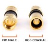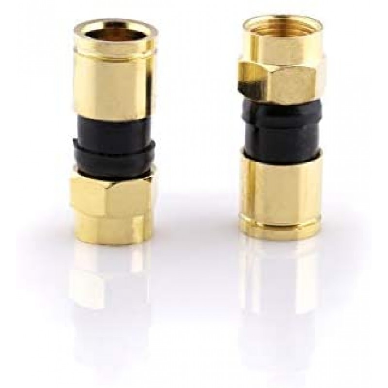Ebeestock, A Family Company located in the USA, is proud to offer these high quality and durable coaxial compression connectors, also known as coax fittings. Compression F81 Connectors, using the F-Pin connection (standard on US Cable systems). Compression Connectors are superior to Crimp and Twist, as they create a waterproof seal at the rear of the connector (the jacket side), and allow a uniform 360 degree connection that keeps the connector on, and the signal tight. Rated from 2MHz 3GHz, this ensures that the coupler will handle all of the signals for DIRECTV, Satellite Dish, other Satellite, CATV (including Comcast, Charter, Cox, and more), as well as Antennas, VCRs, Cable Internet Modems, and other digital and analog systems. These will pass signal for 75Ohm coax wires. The connector works with most RG6 Coax, including Dual Shield, Tri Shield, and Quad Shield. Exceptional return loss and insertion loss specifications. Shielding effectiveness is greater than -90dB. Tests Passed: SCTE-103-2004 (DC Contact Resistance); ANSI/SCTE 60-2004 (Moisture Migration Test); ASTM-B117-03 (Salt Spray Test); ANSI/SCTE-99-2004 (Axial Pull Test); SCTE-98-2004 (Tightening Torque); SCTE-73-2002 (Coaxial Insertion Force); SCTE-48-3-2004 (Shielding Effectiveness); ANSI/SCTE-04-1997 (F Connector Return Loss); SBCA Standards of Physical Dimension Tolerance; and GR-1503-Core, Issue 1, March 1995 (UV Degradation). Connector works with all 21mm "closed" gap tool. We back our product 100%, with easy returns, as well as free technical and customer support.