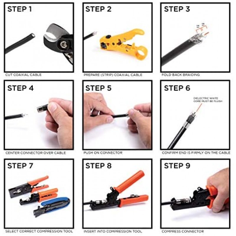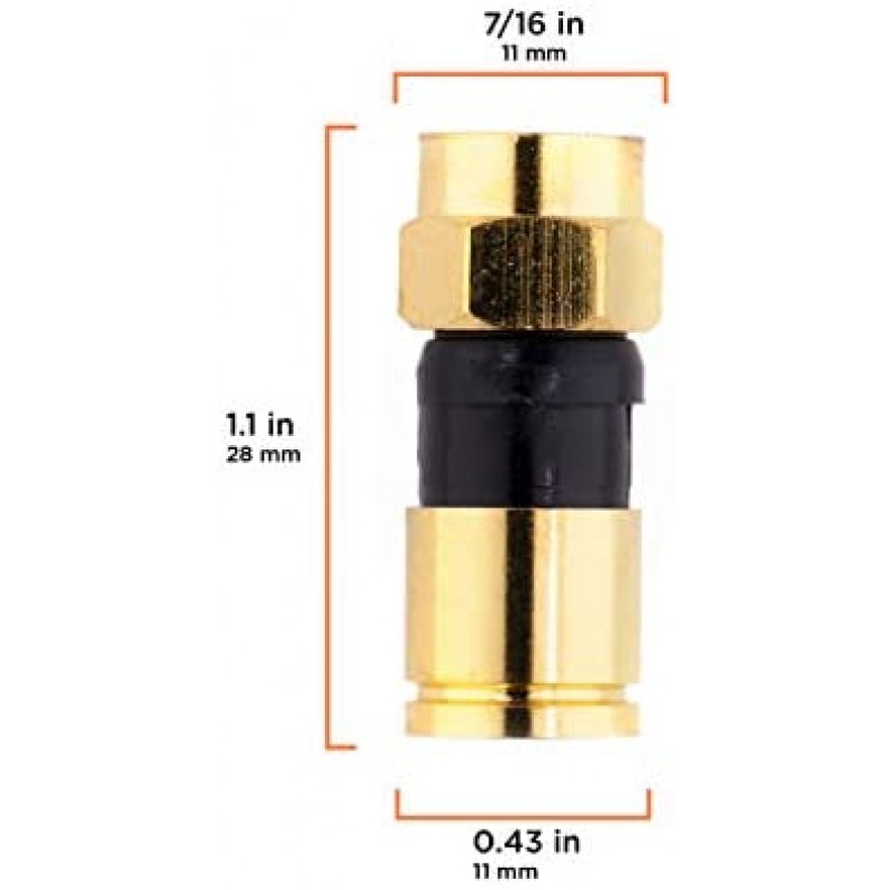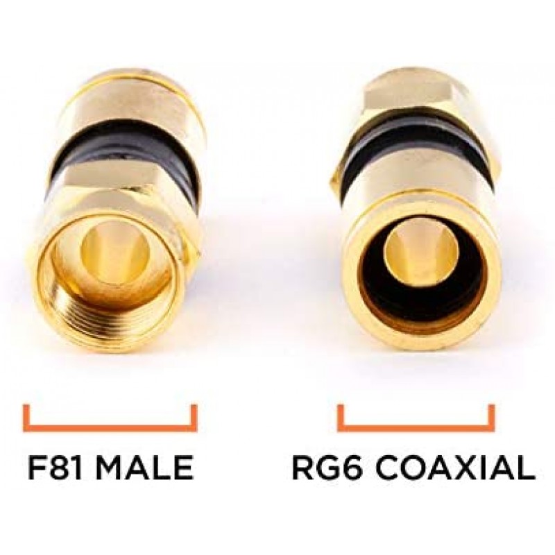 Ebeestock, A Family Company located in the USA, is proud to offer these high quality and durable coaxial compression connectors, also known as coax fittings. Compression F81 Connectors, using the F-Pin connection (standard on US Cable systems). Compression Connectors are superior to Crimp and Twist, as they create a waterproof seal at the rear of the connector (the jacket side), and allow a uniform 360 degree connection that keeps the connector on, and the signal tight. Rated from 2MHz 3GHz, this ensures that the coupler will handle all of the signals for DIRECTV, Satellite Dish, other Satellite, CATV (including Comcast, Charter, Cox, and more), as well as Antennas, VCRs, Cable Internet Modems, and other digital and analog systems. These will pass signal for 75Ohm coax wires. The connector works with most RG6 Coax, including Dual Shield, Tri Shield, and Quad Shield. Exceptional return loss and insertion loss specifications. Shielding effectiveness is greater than -90dB. Tests Passed: SCTE-103-2004 (DC Contact Resistance); ANSI/SCTE 60-2004 (Moisture Migration Test); ASTM-B117-03 (Salt Spray Test); ANSI/SCTE-99-2004 (Axial Pull Test); SCTE-98-2004 (Tightening Torque); SCTE-73-2002 (Coaxial Insertion Force); SCTE-48-3-2004 (Shielding Effectiveness); ANSI/SCTE-04-1997 (F Connector Return Loss); SBCA Standards of Physical Dimension Tolerance; and GR-1503-Core, Issue 1, March 1995 (UV Degradation). Connector works with all 21mm "closed" gap tool. We back our product 100%, with easy returns, as well as free technical and customer support.