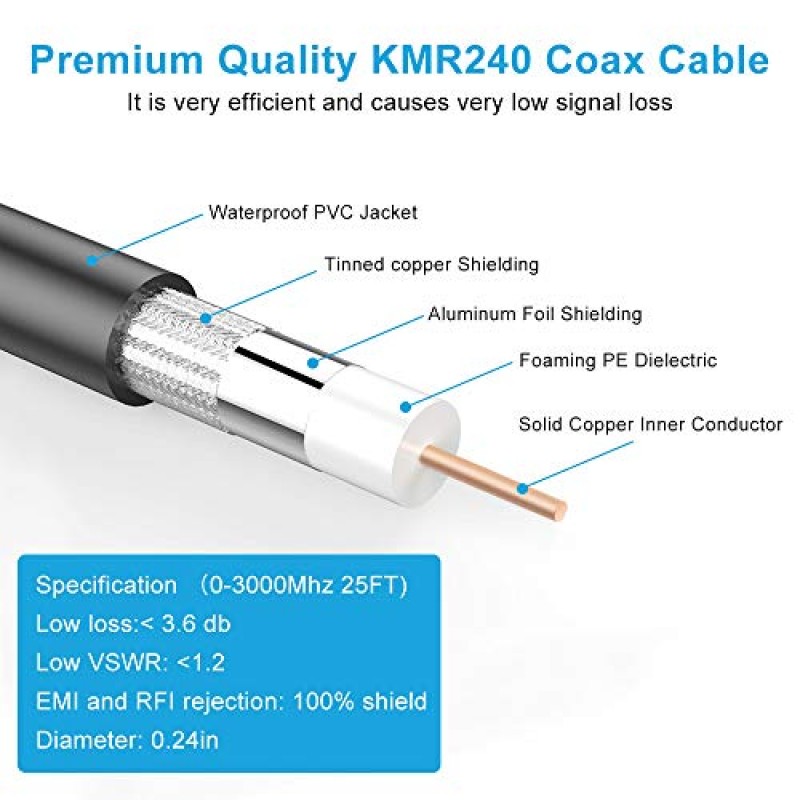 • Ultra Low - loss n male to sma male Coax Cable - It is ideal with an 50-Ohm impedance and work for any 50 Ohm RF system. The signal loss of this n-sma 50 Ohm cable is less than 2.85db on 1800MHz. Swr is less than 1.15. It could support better signal transfer with minimum signal loss over large distances and higher frequency use. This KMR240 cable is LMR240 equivalent (if you’re familiar with those).