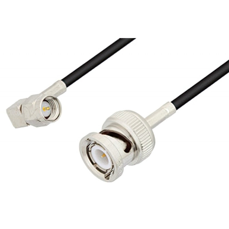 Ebeestock RF coax cable assembly is built with right angle SMA cable connection on one end and BNC cable connection on the other. Our right angle SMA to BNC cable assemblies have a male gender on end 1 and male on end 2. This SMA to BNC cable is a male to male coax assembly, ET21340, can also be known as a right angle SMA plug to BNC plug cable assembly and will be shipped same-day as it is purchased.