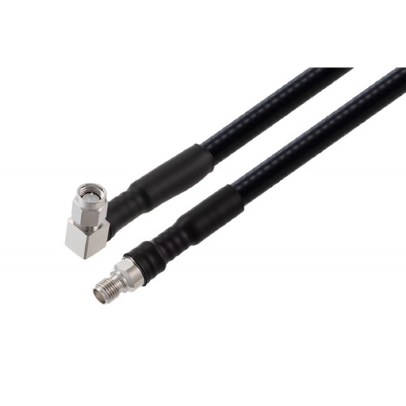 Ebeestock RF coax low PIM cable assembly is built with right angle SMA cable connection on one end and SMA cable connection on the other. Our low PIM right angle SMA to SMA cable assemblies have a male gender on end 1 and female on end 2. This SMA to SMA cable is a male to female coax assembly, ET23950, can also be known as a low PIM right angle SMA plug to SMA jack cable assembly and will be shipped same-day as it is purchased.