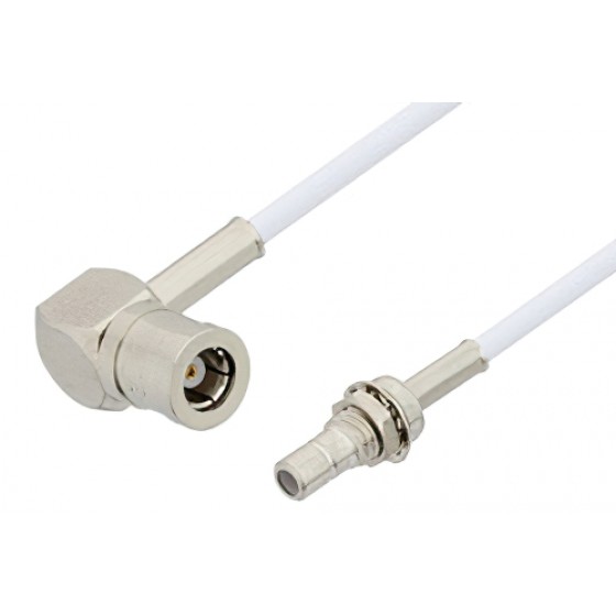 Radio frequency assembly SMB plug right angle to SMB jack bulkhead cable 12 inch length using ET-RG196 coax, RoHS from Ebeestock is part of the largest selections of same-day ship coaxial cables for RF, microwave and millimeter wave interconnect solutions. Ebeestock coaxial cable assembly products are used in applications requiring high quality such as laboratory RF test and measurement, rugged and designed for defense / military, telecom antenna tower component jumper connection, production environments, general use, etc. SMB plug right angle to SMB jack bulkhead cable 12 inch length using ET-RG196 coax, RoHS, like our other Ebeestock coaxial cable assemblies, will ship the same day and any custom SMB to SMB cable assembly orders will ship same day as well.